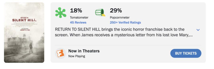(《重返寂静岭》的前作《寂静岭》《寂静岭2》在烂番茄的新鲜度分别只有34%和8%,可见北美影评人对恐怖片还是比较严苛的;这两部电影在豆瓣的评分分别为7.7和5.8,略好一些)